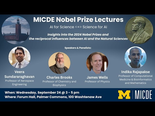 Explore the groundbreaking 2024 Nobel Prizes in Physics and Chemistry through this comprehensive lecture series examining the reciprocal influence between artificial intelligence and the natural sciences. Learn about the foundational advances in neural networks that underpin modern machine learning, which earned the Physics prize, and discover the AI-enabled breakthroughs in protein structure prediction and computational protein design recognized by the Chemistry prize. Begin with opening remarks from Karthik Duraisamy, Professor of Aerospace Engineering and Director of the Michigan Institute for Computational Discovery and Engineering, before diving into detailed presentations on each Nobel Prize. Gain insights into the Chemistry prize through Charles Brooks, Professor of Chemistry and Biophysics, who explains the revolutionary developments in protein research. Understand the Physics prize through Veera Sundararaghavan, Professor of Aerospace Engineering, who covers the neural network innovations that transformed machine learning. Participate in a moderated panel discussion titled "AI for Science - Science for AI" featuring distinguished faculty including James Wells (Physics), Indika Rajapakse (Computational Medicine & Bioinformatics and Mathematics), Charles Brooks (Chemistry and Biophysics), and Veera Sundararaghavan (Aerospace Engineering). Engage in cross-disciplinary discussions that illuminate the intersection of artificial intelligence and scientific discovery, making this essential viewing for anyone interested in understanding how AI is reshaping scientific research and how scientific principles are advancing AI capabilities.