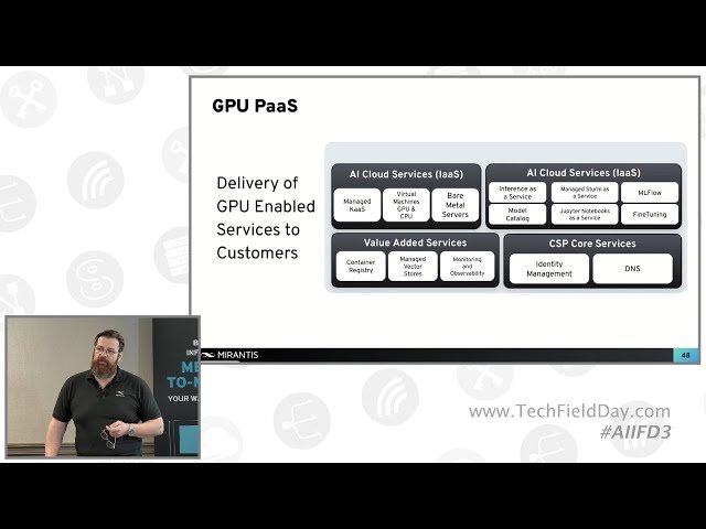 Explore the platform-as-a-service layer that transforms GPU infrastructure into business-ready AI services through this 21-minute conference presentation. Learn how Mirantis k0rdent AI delivers composable service templates that enable operators to expose training, inference, and data services to tenants without requiring custom integration work for each new workload. Discover the catalog approach that allows operators to integrate frameworks like NVIDIA's Run.ai, Kubeflow, or MLflow based on customer preferences, with automatic provisioning of dependencies including cert-manager, GPU operators, and Argo. Watch a live demonstration of deploying an inference cluster template with GPU node profiles and Run.ai services, showcasing how complex manual installations are reduced to a single cluster deployment taking approximately fifteen minutes on AWS. Understand how the system optimizes cost efficiency through intelligent GPU node labeling and workload placement, ensuring GPU-backed nodes handle GPU workloads while CPU tasks run on appropriate nodes. Examine how enterprises can leverage this catalog internally for development acceleration or publish services externally for customers, with support for sovereign operators maintaining air-gapped local GPU hardware and hybrid operators extending across public and private GPU environments. Gain insights into delivering complex AI services quickly while maintaining governance and observability, eliminating the fragile manual integration typically required in GPU PaaS environments.