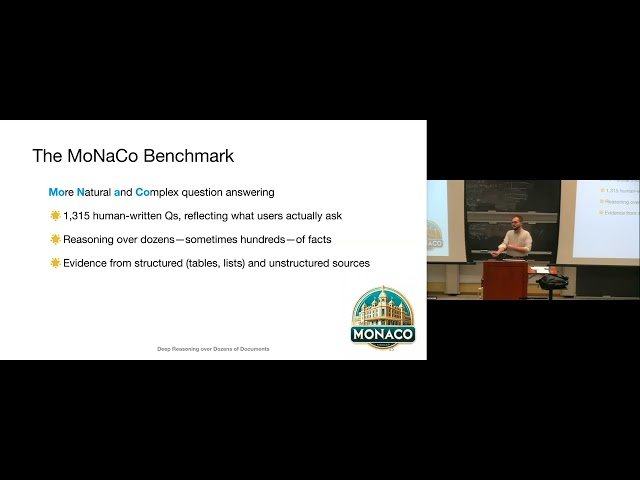 Explore a comprehensive research presentation introducing MoNaCo, a groundbreaking benchmark designed to evaluate the question-answering capabilities of large language models when handling complex, multi-document reasoning tasks. Learn about the development of 1,315 challenging information-seeking questions that require synthesizing and reasoning across dozens of Wikipedia tables and passages, addressing a critical gap in current evaluation methodologies. Discover the performance results of 15 frontier LLMs including GPT-5, o3, Claude Opus 4, Gemini 2.5 Pro, and Deepseek-R1, with the top-performing model achieving only 38.7% perfect scores. Understand how this benchmark reveals that factuality remains a significant challenge for LLMs despite the saturation of many existing factual QA benchmarks, and gain insights into the limitations of current AI systems in handling real-world information synthesis problems similar to those tackled by tools like Deep Research.