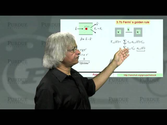 Explore advanced applications of Fermi's Golden Rule in this 22-minute lecture from the nanoHUB-U Fundamentals of Nanoelectronics Part B course. Delve into multiple detailed examples demonstrating how Fermi's Golden Rule applies to quantum transport phenomena in nanoelectronic systems. Work through seven comprehensive problem sets that illustrate the mathematical framework and physical principles underlying transition rates between quantum states. Examine how this fundamental quantum mechanical principle governs electron transport in nanoscale devices where quantum effects dominate classical behavior. Build upon foundational concepts in quantum mechanics and statistical mechanics to understand how Fermi's Golden Rule enables calculation of scattering rates, tunneling probabilities, and other transport coefficients essential for analyzing modern nanotransistors. Connect theoretical quantum mechanical formalism to practical applications in nanoelectronics, where devices contain billions of transistors with active regions spanning only hundreds of atoms.