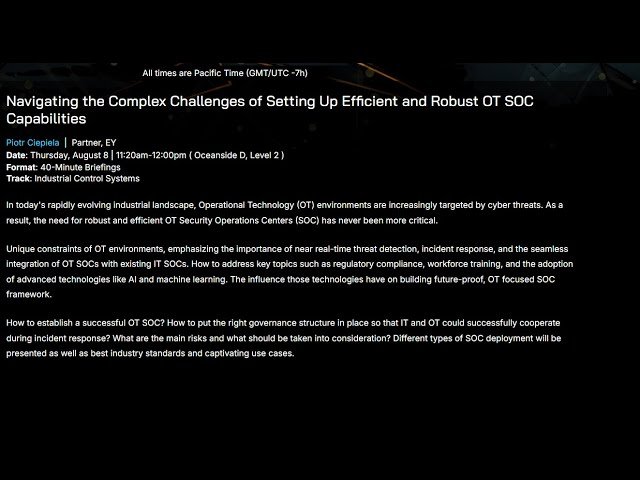 Explore a comprehensive Black Hat conference talk that delves into the critical challenges of establishing effective Operational Technology (OT) Security Operations Centers in today's threat landscape. Learn about the unique constraints of OT environments and discover strategies for implementing near real-time threat detection and incident response systems. Understand how to successfully integrate OT SOCs with existing IT security infrastructure, address regulatory compliance requirements, and develop specialized workforce training programs. The presentation covers the implementation of advanced technologies like AI and machine learning in OT security, establishing proper governance structures for IT-OT cooperation during incidents, and identifying key risks in the OT security domain. Examine different SOC deployment models alongside industry best practices and real-world use cases that demonstrate successful implementation strategies. This 33-minute briefing by Piotr Ciepiela, Partner at EY, provides essential knowledge for security professionals looking to strengthen industrial cybersecurity postures.