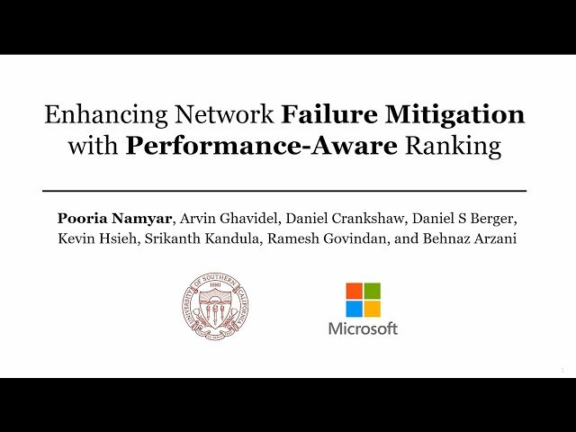 Learn about advanced network failure mitigation techniques in this 16-minute conference talk from NSDI '25 that presents a novel performance-aware ranking system for cloud datacenter networks. Discover how researchers from the University of Southern California and Microsoft developed innovative methods to optimize end-to-end flow-level metrics rather than relying on traditional local criteria or global proxy metrics for network failure response. Explore the technical approach that enables quick estimation of mitigation impact and high-fidelity ranking of different response actions, supporting a broader range of mitigation strategies through holistic analysis. Examine real-world results from a large cloud provider demonstrating orders of magnitude improvements in flow completion time and throughput, while understanding how this approach scales effectively to large datacenter environments. Gain insights into the limitations of existing network mitigation systems and how direct optimization of flow-level performance metrics can significantly enhance network reliability and performance in cloud infrastructure.