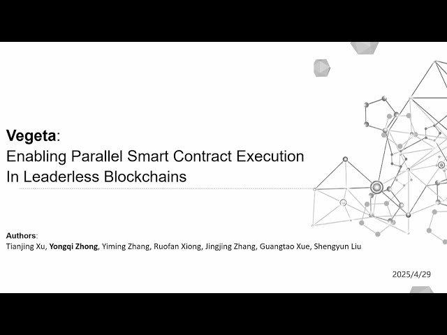 Learn about Vegeta, a novel framework designed to enable parallel smart contract execution in leaderless blockchain systems through this 18-minute conference presentation from NSDI '25. Discover how researchers from Shanghai Jiao Tong University, Xiamen University, and Fudan University address the performance bottleneck of smart contract execution in modern Byzantine-Fault Tolerant consensus protocols that can order hundreds of thousands of transactions per second. Explore the innovative speculate-order-replay framework specifically tailored for leaderless consensus protocols, which allows each proposer to pre-process transactions before consensus to better utilize computing resources. Understand how Vegeta speculatively executes transaction series, analyzes their dependencies prior to consensus, and deterministically replays the schedule to achieve significant performance improvements. Examine the experimental results showing up to 7.8× speedup compared to serial execution under real-world Ethereum workloads on 16vCPU virtual machines, and 6.9× speedup when deployed on a 10-node leaderless consensus protocol, demonstrating the practical effectiveness of parallel execution in blockchain systems.