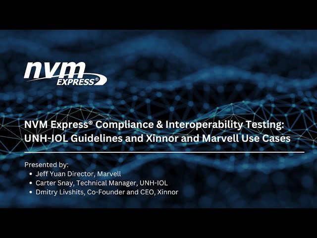 Explore the comprehensive NVMe compliance and interoperability testing program through this 37-minute webinar featuring collaboration between the University of New Hampshire InterOperability Laboratory (UNH-IOL) and the NVM Express organization. Learn how this decade-long partnership has advanced an open ecosystem for NVM Express technology by developing robust testing protocols that ensure NVMe devices operate reliably across diverse platforms, drivers, and hardware configurations. Discover the scope of testing services available to NVM Express members and understand how these programs help vendors validate their products while accelerating time to market. Gain insights from UNH-IOL representatives Carter Snay explaining testing guidelines, alongside real-world perspectives from industry experts Jeff Yuan from Marvell and Dmitry Livshits from Xinnor who share their companies' experiences with the testing process. Participate in a live Q&A session addressing technical and logistical questions about NVMe testing procedures and learn how to get involved in the compliance and interoperability testing program.