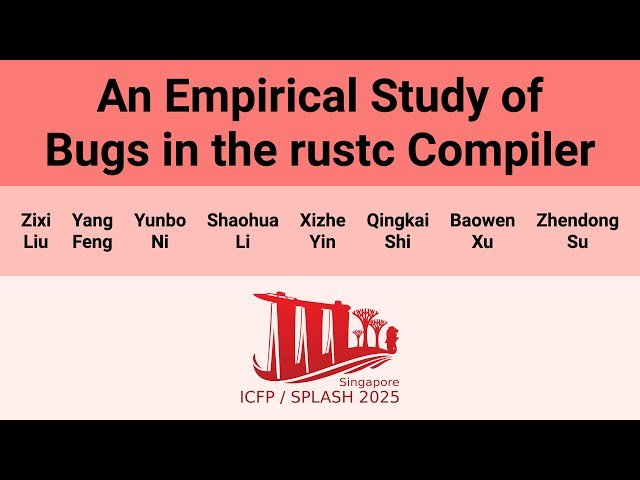 Explore a comprehensive empirical study examining bugs in the Rust compiler (rustc) through this 14-minute conference presentation from OOPSLA 2025. Delve into a systematic analysis of 301 manually reviewed compiler issues reported between 2022 and 2024, focusing specifically on bugs originating in semantic analysis and intermediate representation processing stages that implement essential Rust language features like ownership and lifetimes. Learn how Rust's unique memory safety guarantees and specialized mechanisms such as trait solving, borrow checking, and specific optimizations introduce complexity that results in bugs uncommon in traditional compilers. Discover key findings revealing that rustc bugs primarily arise from Rust's type system and lifetime model, with frequent errors occurring in High-Level Intermediate Representation (HIR) and Mid-Level Intermediate Representation (MIR) modules due to complex checkers and optimizations. Understand how bug-revealing test cases often involve unstable features, advanced trait usages, lifetime annotations, standard APIs, and specific optimization levels, while examining the limitations of existing testing tools in detecting non-crash errors. Gain insights into the categorization of bugs based on their causes, symptoms, affected compilation stages, and test case characteristics, along with an evaluation of current rustc testing tools and their effectiveness. Access supplementary materials including the full research article and artifact archive with reusable and reproduced results to support further research in compiler reliability and Rust program safety.