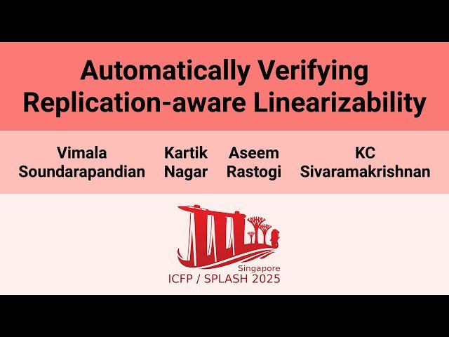 Explore a 14-minute conference presentation from OOPSLA 2025 that introduces a groundbreaking automated verification technique for replication-aware linearizability in distributed systems. Learn how researchers from IIT Madras, Microsoft Research, and Tarides have developed a novel approach to verify Mergeable Replicated Data Types (MRDTs) and state-based Conflict-free Replicated Data Types (CRDTs) that goes beyond traditional correctness specifications.
