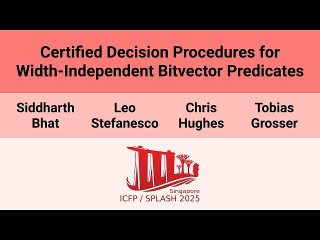 Watch a 16-minute conference presentation from OOPSLA 2025 that introduces novel mechanized decision procedures for width-independent bitvector predicates in the Lean interactive theorem prover. Learn how researchers from the University of Cambridge address the gap in automation for width-independent bitvector reasoning by developing certified algorithms that view classical decision procedures through the lens of model checking, where formulas correspond to automata and correctness becomes a safety property. Discover the mechanization of key model checking algorithms including k-induction, automata reachability, automata emptiness checking, and automata minimization, which enable scalable decision procedures for bitvector predicates. Explore the implementation of MBA-Blast, a fast algorithm for controlled fragments mixing arithmetic and bitwise operations commonly found in deobfuscation literature, which outperforms general procedures on specific fragments. Examine evaluation results on benchmarks from compiler problems including Hacker's Delight and LLVM peephole optimizer, as well as equivalence checking for program obfuscation, where the tools achieve 100% success on Hacker's Delight, 100% on deobfuscation datasets with two tools, and up to 27% on LLVM peephole rewrites. Understand how these decision procedures provide push-button automation for width-independent bitvector reasoning in interactive theorem provers and establish foundational algorithms for fast, formally verified model checking.