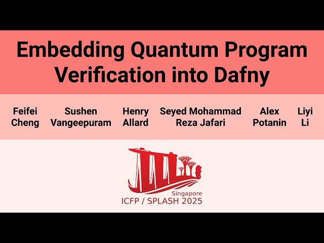 Explore a groundbreaking conference presentation that introduces QafnyC, an innovative system for formally verifying quantum programs by compiling their verification into the classical program verifier Dafny. Learn how researchers from Iowa State University and Australian National University address the inherent challenges of quantum program verification, including probabilistic behavior and quantum superposition parallelism, through a novel approach that separates verification from execution. Discover the key insight behind leveraging classical verifiers to ensure correctness before compiling certified quantum programs into executable circuits. Examine the comprehensive evaluation demonstrating successful verification of 37 diverse quantum programs, representing the most extensive formally verified set of quantum programs to date. Gain insights into how this system bridges the gap between quantum computing theory and practical program verification, enabling developers to formally prove the correctness of quantum algorithms before deployment. Understand the technical implementation details, architectural decisions, and practical applications of this verification framework that advances the field of quantum software engineering and automated program verification.