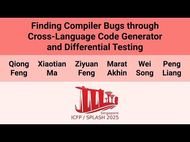 Explore a 14-minute conference presentation from OOPSLA 2025 that introduces CrossLangFuzzer, a groundbreaking framework for detecting compiler bugs in cross-language compilation scenarios. Learn how researchers from Nanjing University of Science and Technology, JetBrains, and Wuhan University developed the first systematic approach to identify and diagnose compiler correctness issues when multiple JVM-based languages interact. Discover the innovative universal intermediate representation (IR) designed for JVM languages and understand how three mutation techniques—LangShuffler, FunctionRemoval, and TypeChanger—enhance test program diversity to uncover hidden compiler bugs. Examine the impressive results showing 24 confirmed compiler bugs across Kotlin, Groovy, Scala 2, Scala 3, and Java compilers, with TypeChanger proving most effective by detecting 11 bugs. Gain insights into the symptoms and root causes of cross-compilation bugs, understand the responsibilities of different language compilers when incorrect behavior occurs, and explore how differential testing can improve compiler correctness in multi-language environments where code safety and reliability are paramount.