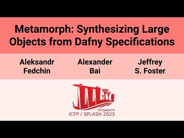 Explore a conference presentation introducing Metamorph, a novel synthesis tool that generates sequences of method calls to construct complex objects satisfying formal specifications in the Dafny programming language. Learn how this innovative approach addresses the computational challenges of synthesizing long sequences of API calls by using counterexamples from the Dafny verifier to reason about method effects incrementally, rather than analyzing entire sequences simultaneously. Discover the tool's two key distance metrics for guiding synthesis, including a piecewise distance metric that provides provably correct lower bounds on solution length and enables framing synthesis as weighted A* search. Understand how the piecewise distance computation treats object states as conjunctions of atomic constraints, identifies which constraints each method call can satisfy, and combines this information through integer programming. Examine evaluation results demonstrating Metamorph's capability to construct programs requiring up to 57 method calls across six benchmark data structures including linked lists, queues, arrays, binary trees, and graphs. See how integration with DTest, Dafny's automated test generation toolkit, enables synthesis of test inputs for parts of the AWS Cryptographic Material Providers Library that were previously uncoverable, and learn about applications extending to executable bytecode generation for virtual machines, showcasing the broader applicability of specification-guided synthesis techniques.