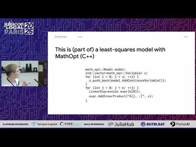 Learn how to access Google's award-winning optimization solvers through Julia's JuMP modeling package in this 25-minute conference talk from JuliaCon Local Paris 2025. Discover the ORTools.jl package that bridges the gap between Julia's ease of use and Google's powerful Glop, CP-SAT, and PDLP solvers, making these previously inaccessible tools available to Julia users for mathematical optimization. Explore the key features of the ORTools.jl package and gain insights into the technical challenges encountered during its development. Understand how this integration enhances Julia's optimization ecosystem by providing access to Google's sophisticated solving capabilities through the familiar JuMP interface.