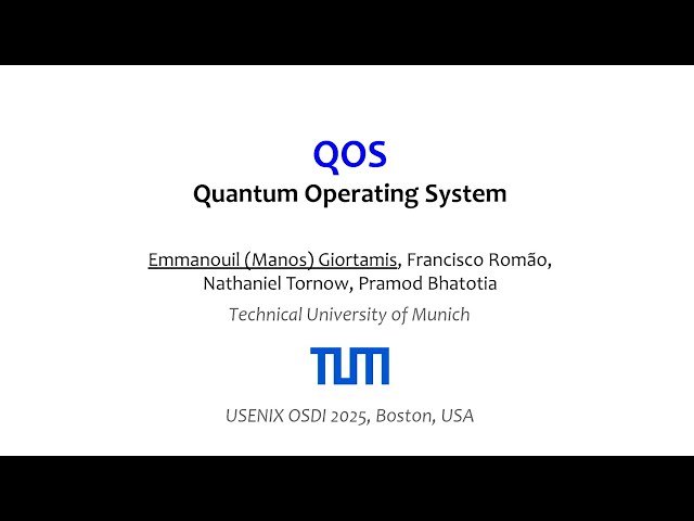 Explore the development of QOS, a modular quantum operating system designed to address critical challenges in quantum resource management through this 15-minute conference presentation from OSDI '25. Learn how quantum computers face significant obstacles including hardware constraints, noise errors, and heterogeneity that create fundamental design tradeoffs between quantum fidelity and system utilization, making it difficult to scale quantum algorithms reliably. Discover QOS's comprehensive approach to quantum resource management through its hardware-agnostic API that enables transparent quantum job execution while mitigating hardware errors and systematically multi-programming and scheduling jobs across space and time. Understand the system's modular design that facilitates synergistic cross- and intra-layer optimizations, introducing innovative concepts such as compatibility-based multi-programming and effective utilization metrics. Examine the extensive evaluation results from 7000 real quantum runs across more than 70,000 benchmark instances on IBM quantum devices, demonstrating QOS's ability to achieve 2.6-456.5× higher fidelity, increase resource utilization by up to 9.6×, and reduce waiting times by up to 5× while sacrificing only 1-3% fidelity on average compared to baseline systems.
