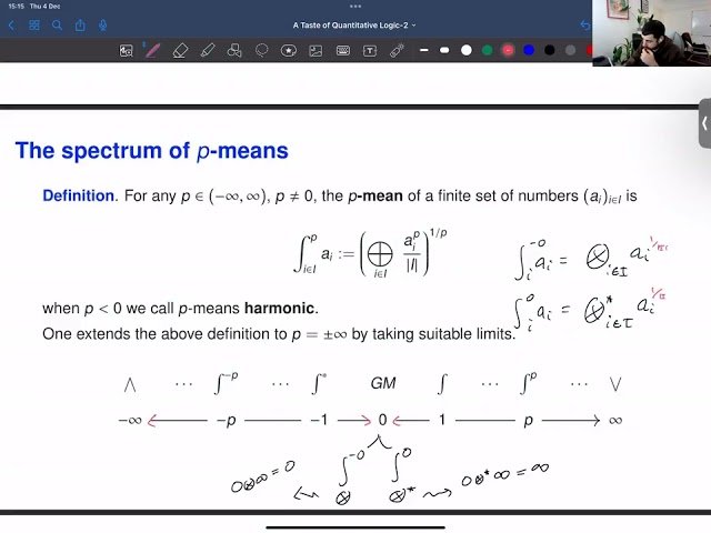 Explore advanced concepts in quantitative logic through this Oxford seminar that delves into p-means as quantitative analogues of first-order quantifiers and their application in constructing hyperdoctrines valued in enriched graded preorders. Learn how p-means provide a mathematical framework for extending classical logical quantifiers into quantitative settings, offering new perspectives on logical reasoning with degrees rather than binary truth values. Discover the construction methodology for hyperdoctrines that serve as the intended semantics for first-order quantitative linear logic, bridging category theory, logic, and quantitative reasoning. Examine the theoretical foundations that connect enriched category theory with logical systems, particularly focusing on graded preorders and their role in semantic structures. Gain insights into how quantitative linear logic extends traditional linear logic by incorporating quantitative aspects while maintaining its resource-sensitive nature. Understand the mathematical machinery behind hyperdoctrines and their significance in providing semantic models for advanced logical systems that can handle both qualitative and quantitative information.