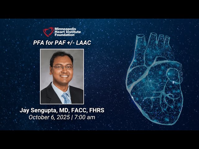 Learn about pulsed field ablation (PFA) for paroxysmal atrial fibrillation with or without left atrial appendage closure (LAAC) in this 57-minute cardiovascular grand rounds presentation by Dr. Jay Sengupta, MD, FACC, FHRS from the Minneapolis Heart Institute Foundation. Explore the latest techniques and clinical considerations for treating paroxysmal atrial fibrillation using pulsed field ablation technology, including when to combine this approach with left atrial appendage closure procedures. Gain insights into patient selection criteria, procedural techniques, outcomes, and the evolving role of PFA in contemporary electrophysiology practice from an experienced cardiac electrophysiologist and fellow of the American College of Cardiology and Heart Rhythm Society.
