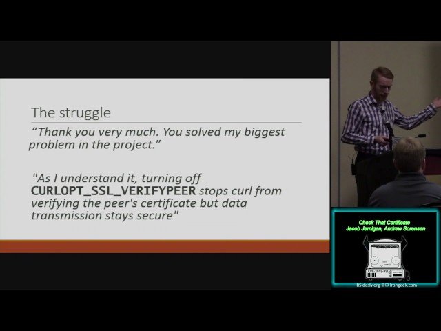 Explore certificate validation techniques and best practices in this informative conference talk from BSidesLV 2015. Delve into the intricacies of certificate checking as security experts Jacob Jernigan and Andrew Sorensen share their insights and expertise. Learn about common pitfalls, advanced validation methods, and strategies to enhance your organization's security posture through proper certificate management. Gain valuable knowledge on how to effectively verify and authenticate digital certificates, protecting your systems from potential vulnerabilities and attacks.