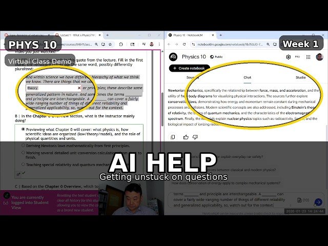 Learn how to navigate and maximize your success in Physics 10 through this comprehensive workflow demonstration that showcases the course's flexible design and available resources. Discover how to effectively use accurate captions to navigate lecture videos, revisit specific segments when needed, and move seamlessly between lectures and questions without restrictions. Explore the course's public NotebookLM site featuring continuously updated lecture transcripts and understand how to responsibly use AI tools to overcome challenges with fill-in-the-blank items. Master the mechanics of MyOpenMath attempts, understand score delays and rounding procedures, and learn how module point thresholds function within the course structure. Gain insight into how weekly question sets and assessments connect to the required one-on-one meeting, and understand why you can still make progress even when certain fill-in-the-blank items prove challenging.