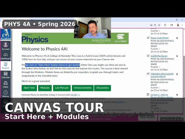 Explore the comprehensive structure and expectations of a college-level introductory physics course through this detailed orientation session. Learn essential navigation strategies for the Canvas learning management system, including the recommended workflow using Modules and "Start Here" sections while avoiding reliance on the Canvas to-do list. Discover effective communication protocols for live Zoom sessions, including techniques for asking questions and sending private chat messages that won't appear in recordings. Master the course communication flow by ensuring proper email and Canvas notification settings to stay connected with instructors and course updates. Understand scheduling fundamentals including virtual class sessions and office hours, plus the feedback collection process for potential timing adjustments. Navigate in-person laboratory logistics with crucial information about off-campus lab locations and correct addresses to ensure you arrive at the right facility. Complete the required Honor Code Pledge correctly by understanding why it's mandatory and following proper submission guidelines, including acceptable typing methods and avoiding copy-paste violations. Grasp the unique grading system that eliminates traditional exams and quizzes in favor of contract grading and ungrading approaches, where your final grade depends primarily on demonstrating physics problem-solving skills during a required one-on-one meeting with the instructor. Choose between standard and accelerated tracks for your required meeting while learning the importance of early scheduling. Review critical early-semester deadlines including the first MyOpenMath assignment and understand how the late pass system functions to provide flexibility when needed.