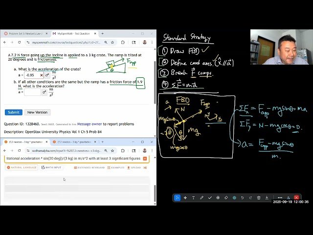 Learn to solve a complex physics problem from OpenStax University Physics Volume 1, Chapter 5, Problem 84 in this 16-minute lecture recording from a Fall 2025 PHYS 4A class, where you'll work through step-by-step problem-solving techniques and apply fundamental physics principles covered in the introductory mechanics curriculum.