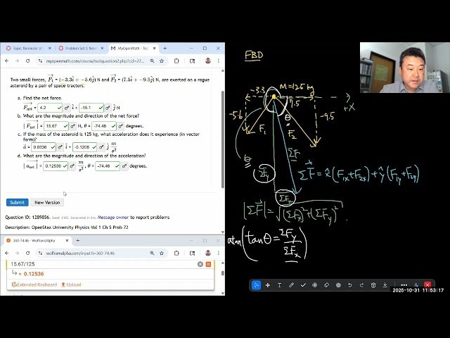 Watch a 15-minute physics lecture that works through two specific problem-solving examples from Chapter 5 of OpenStax University Physics Volume 1, focusing on Problems 72 and 79. Learn step-by-step approaches to tackling these particular physics problems as demonstrated in a Fall 2025 PHYS 4A classroom setting, gaining insight into problem-solving techniques and mathematical applications relevant to introductory university-level physics concepts covered in Chapter 5.