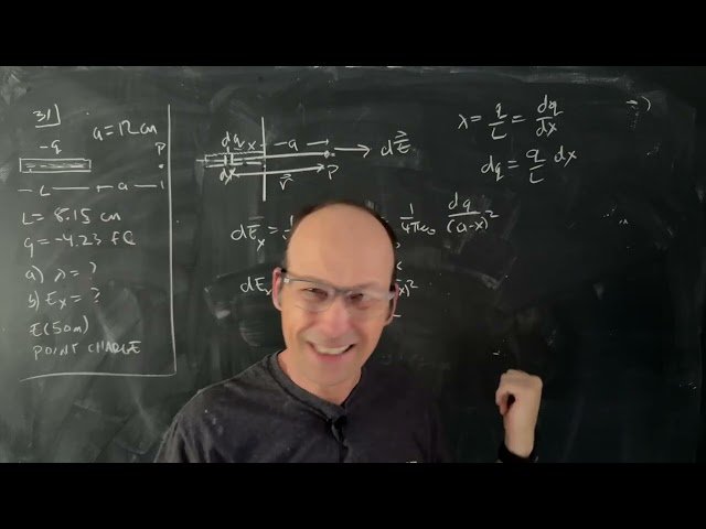 Learn how to solve a physics problem involving the calculation of electric field produced by a uniformly charged rod through a detailed video walkthrough. Work through the determination of linear charge density and analyze both magnitude and direction of the electric field at a specific point using a nonconducting rod with length 8.15 cm and charge -4.23 fC. Follow along with Python code demonstrations to visualize and compute the solution, making this complex electromagnetic problem more approachable. Part of a comprehensive 24-problem series covering fundamental physics concepts from Halliday Resnick and Walker's textbook.