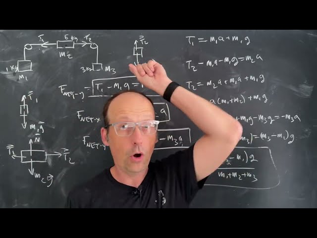 Learn to solve a complex physics problem involving a 6 kg cart on a frictionless horizontal track with two hanging masses of 1 kg and 3 kg connected by strings over pulleys on either side, requiring you to calculate the acceleration of the masses and determine the magnitude of tension in both strings using principles of mechanics and force analysis.