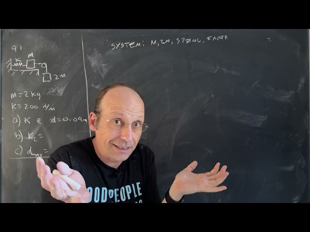 Learn how to solve a complex physics problem involving two connected masses - one on a frictionless horizontal surface and one hanging vertically - with a spring system and gravitational forces. Through this 20-minute video tutorial from the "Physics in 24 Problems" series, master the step-by-step solution for calculating kinetic energy and maximum displacement in a spring-mass system. Analyze how to determine the combined kinetic energy of both blocks, the individual kinetic energy of the hanging block after falling 0.09 meters, and find the maximum falling distance before the hanging block stops momentarily. The problem demonstrates key concepts in mechanical energy conservation, spring potential energy, and gravitational potential energy using a system with a 200 N/m spring constant and masses of 2.0 kg and 4.0 kg.