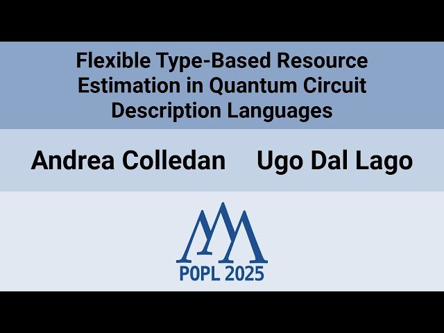 This conference talk presents a novel type system for the Quipper quantum programming language that enables flexible resource estimation of quantum circuits. Learn how researchers Andrea Colledan and Ugo Dal Lago from the University of Bologna and Inria developed a system to derive upper bounds on circuit size using various metrics including width, depth, and gate count. The approach combines effects and refinement types with indices (generic arithmetic expressions interpreted differently based on the target metric) to achieve remarkable flexibility. The presentation demonstrates how the QuRA tool implements this type system, showing that tight bounds can often be automatically inferred. The research contributes significantly to quantum computing resource analysis, with full details available in the accompanying paper. Presented at the POPL 2025 conference, this 19-minute talk is essential viewing for those interested in quantum programming languages, type systems, and resource estimation techniques.