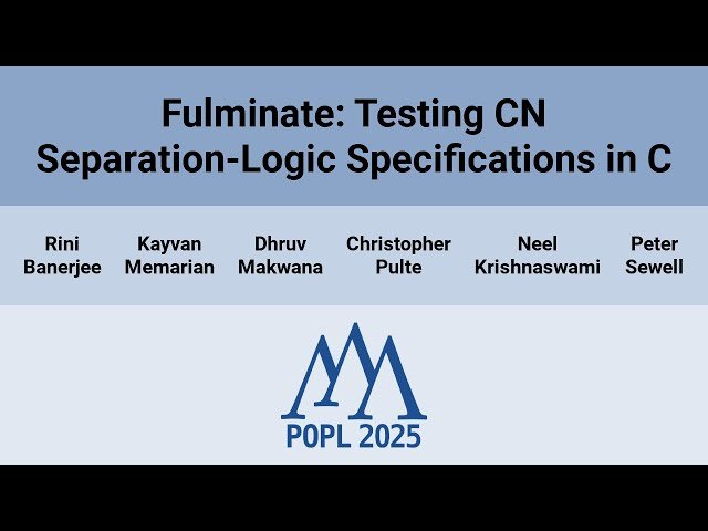 This conference talk presents research on Fulminate, a novel approach for testing CN separation-logic specifications in C through runtime verification. Learn how researchers from the University of Cambridge developed a system that translates separation logic specifications into executable runtime checks, addressing the challenge of evaluating separation-logic formulas during concrete execution. The presentation explores how a restricted fragment of separation logic used in the CN proof tool enables practical runtime testing with ownership checks and ownership transfer capabilities. Discover the implementation details of this C+CN source to C source translation tool and see demonstrations on complex examples, including an allocator from a production hypervisor. The talk covers the formalization of the runtime ownership testing scheme and proves how its reified ghost state correctly captures ownership passing in a C-like language semantics. Valuable for researchers and developers interested in program verification, separation logic, refinement types, and runtime testing for systems programming languages.
