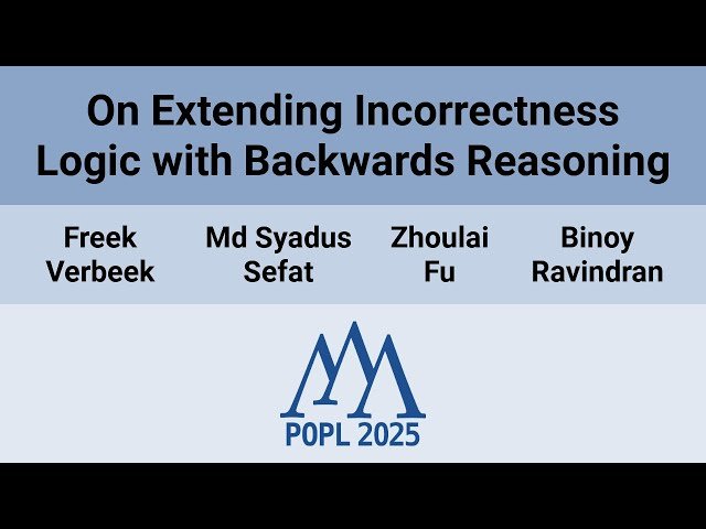 Watch this 20-minute conference talk from POPL 2025 that explores an extension of O'Hearn's incorrectness logic (IL) to enable backwards reasoning. Learn how researchers Freek Verbeek, Md Syadus Sefat, Zhoulai Fu, and Binoy Ravindran address the limitations of current IL by incorporating underspecification. The presentation explains how this extended logic combines underspecification with underapproximation, allowing developers to focus on fewer paths while only formulating constraints over relevant variables. Discover the soundness and completeness proofs of their system, practical proof strategies for deriving presumptions from results, and how loop summaries can be effectively utilized in this context. The research has been formally verified in the Isabelle/HOL theorem prover, with artifacts available for further exploration. This talk is part of the ACM SIGPLAN POPL 2025 conference held January 19-25, 2025.