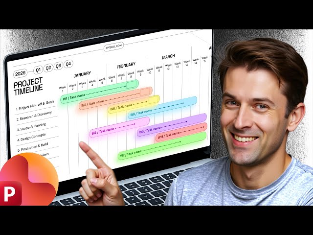 Learn to create an interactive, animated project timeline in PowerPoint that allows users to click quarterly buttons (Q1, Q2, Q3, Q4) to smoothly scroll through different time periods and view associated tasks. Master the integration of slide zooms within timeline tasks to enable jumping to specific slides for additional details, combining advanced PowerPoint animation techniques with interactive navigation. Build the timeline step-by-step starting with layout grids and button creation, then progress through table construction, masking techniques, and task placement before implementing slide zoom functionality and invisible slide zoom features. Configure timeline scrolling mechanics, set up button hyperlinks for seamless navigation, and apply morph transitions to create smooth animations between different timeline views. Download free slide templates to follow along with the tutorial and gain hands-on experience with advanced PowerPoint presentation design techniques that transform static timelines into dynamic, clickable project management tools.