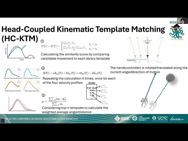 This IEEE conference talk explores a novel approach to predicting ray pointer landing poses in virtual reality using multimodal LSTM-based neural networks. Discover how researchers from Xi'an Jiaotong-Liverpool University, Hong Kong University of Science and Technology, Simon Fraser University, and Tsinghua University tackle the crucial challenge of target selection in VR interaction. Learn about their implementation of prediction heuristics to enhance user experience through an LSTM neural network that processes time-series data from three channels: hand movements, head-mounted display positioning, and eye tracking. Examine the research methodology involving two studies - one gathering motion data to identify optimal modality combinations, and another validating raycasting across various distances, angles, and target sizes. The presentation reveals impressive results showing prediction accuracy within 4.6° and improvements of 3.5 and 1.9 times compared to baseline and prior kinematic methods respectively. Part of the "Enhancing Interaction and Feedback in Virtual and Cross-Reality Systems" session at IEEE VR 2025.