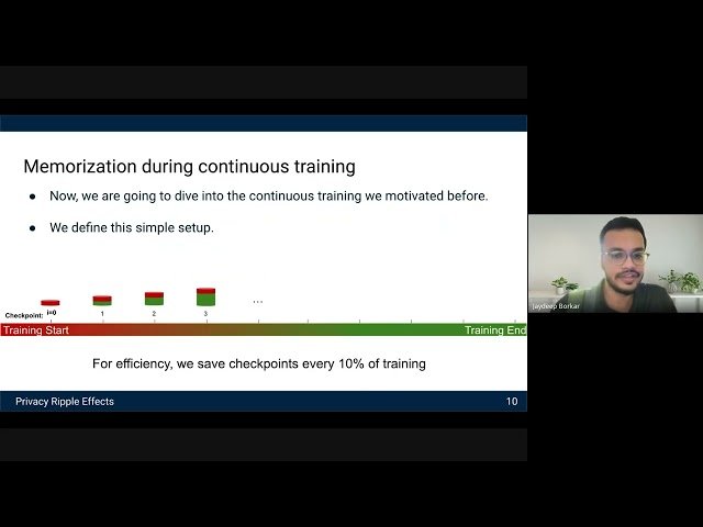 Explore the dynamic privacy implications of personally identifiable information (PII) in large language model training through this 42-minute Google TechTalk presented by Jaydeep Borkar. Discover how PII memorization evolves throughout training pipelines and depends on commonly altered design choices, challenging the assumption that privacy risks are static. Learn about three novel phenomena that create unexpected privacy vulnerabilities: assisted memorization, where similar-appearing PII seen later in training can trigger recall of earlier sequences (accounting for up to one-third of memorization cases); amplified memorization, where adding new PII can increase memorization of existing PII by as much as 7.5 times; and compensatory memorization, where removing PII paradoxically leads to increased memorization of other personal information. Understand how these first- and second-order privacy risks emerge from routine training decisions including dataset curation changes, new data scraping for retraining, and downstream fine-tuning stages. Gain insights into the complex interplay between training dynamics and privacy preservation, essential for model creators seeking to minimize PII regurgitation risks while maintaining model performance.