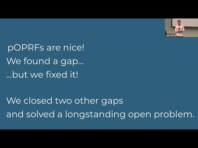 Explore advanced cryptographic concepts in this conference session from Crypto 2025 chaired by Lisa Kohl, focusing on pseudorandom functions and their applications in modern cryptography. Delve into cutting-edge research presentations that examine the theoretical foundations, practical implementations, and security properties of pseudorandom functions within cryptographic systems. Learn about the latest developments in this fundamental cryptographic primitive through expert presentations and discussions that cover both theoretical advances and practical considerations. Access comprehensive materials including research papers and presentation slides to deepen your understanding of how pseudorandom functions contribute to secure cryptographic protocols and systems.