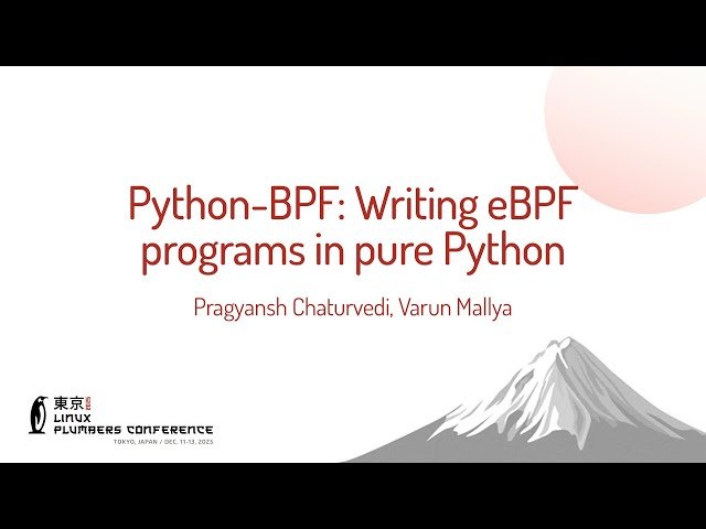 Explore Python-BPF, an innovative project that enables writing eBPF programs entirely in pure Python through this 33-minute conference talk from the Linux Plumbers Conference. Learn how this tool allows developers to use a reduced Python grammar for eBPF-specific code sections, unifying both eBPF logic and userspace code within the same Python file. Discover the advantages this approach offers over traditional BCC implementations, including improved development tool compatibility, enhanced data processing capabilities using Python's rich ecosystem, and simplified visualization through libraries like matplotlib and seaborn. Understand how Python-BPF facilitates rapid prototyping of BPF programs with familiar, easy-to-learn syntax while supporting execution in Jupyter notebooks. Examine the current capabilities and limitations of this early-stage project, including its support for various map types and eBPF helpers, and see practical examples ported from the BCC tutorial that demonstrate improved visualization techniques beyond ASCII histograms.