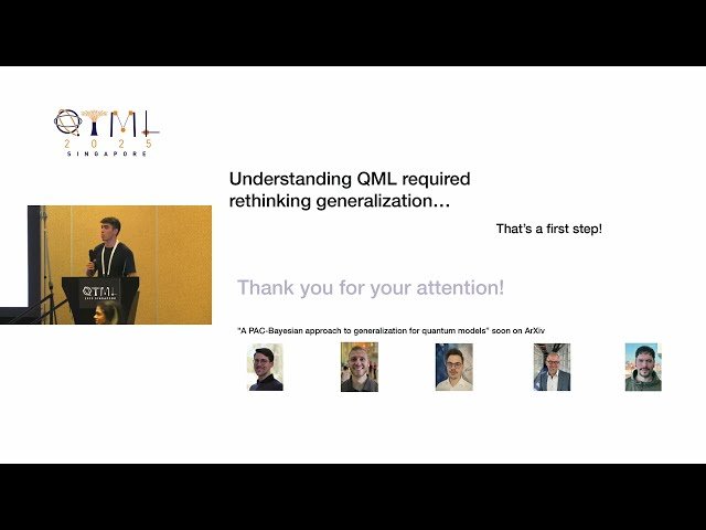Explore a groundbreaking PAC-Bayesian framework for analyzing generalization in quantum machine learning models through this 20-minute conference talk from QTML 2025. Discover how researchers Pablo Rodriguez-Grasa, Matthias C. Caro, Jens Eisert, Elies Gil-Fuster, Franz J. Schreiber, and Carlos Bravo-Prieto address the limitations of traditional uniform bounds in quantum machine learning by developing the first PAC-Bayesian generalization bound for a broad class of QML models. Learn about their innovative approach to analyzing layered circuits composed of general quantum channels, parameterized via process matrices, which encompasses unitary, dissipative, and feedforward operations. Understand how channel perturbation analysis enables the establishment of non-uniform generalization bounds that explicitly depend on the norms of post-training parameter matrices, creating data-dependent bounds that reflect the properties of learned solutions. Examine how this framework connects channel perturbation theory with PAC-Bayesian analysis to provide improvements over existing uniform, covering-number-based bounds, offering a more nuanced and training-aware approach to understanding generalization in quantum machine learning systems.