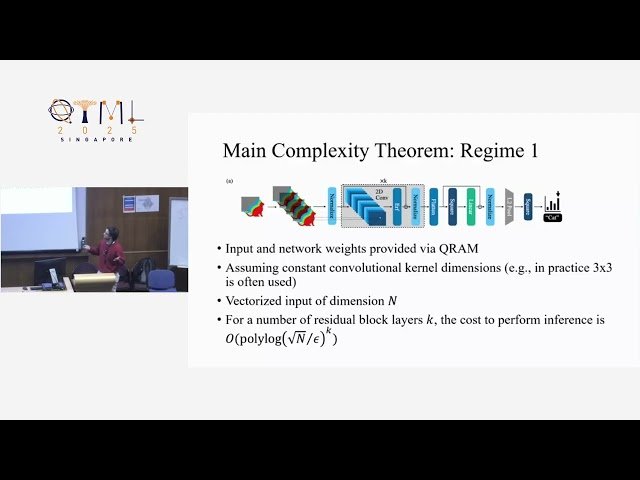Explore a conference talk examining quantum acceleration methods for deep learning inference in multilayer convolutional neural networks. Discover how fault-tolerant Quantum Processing Units (QPUs) can potentially deliver exponential speedups for pre-trained networks that output probability distributions over classes or tokens. Learn about the integration challenges of quantum computing into classical deep-learning pipelines and understand which network architectures can benefit from quantum acceleration under different Quantum Random Access Memory (QRAM) assumptions. Examine fundamental residual blocks composed of regularized multi-filter 2D convolutions, sigmoid activations, skip-connections, and layer normalizations that echo ResNet structure. Analyze three distinct computational regimes: regime 1 where both input tensors and network weights utilize QRAM achieving O(polylog(N)^d) inference cost, regime 2 maintaining only weights in QRAM while requiring O(N) input loading cost yet enabling quartic speedups for shallow bilinear networks, and regime 3 operating without QRAM where quantum advantages must exploit high-dimensional latent feature transforms. Understand the end-to-end complexity bounds that account for both input and memory assumptions, with practical applications including multi-turn LLM chat scenarios with repeated calls to slowly-changing inputs. Gain insights into why known dequantization methods may not apply to certain quantum acceleration approaches and explore the limitations and opportunities for quantum speedup in terms of input dimensions and network parameters.