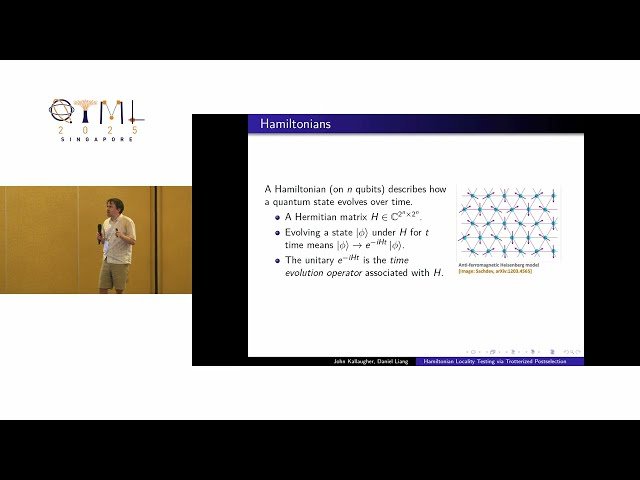 Learn about cutting-edge quantum algorithm research in this 20-minute conference talk that presents novel theoretical results for the Hamiltonian locality testing problem. Explore how to determine whether a Hamiltonian is close to being k-local or far from any k-local Hamiltonian using minimal evolution time, with authors John Kallaugher and Daniel Liang presenting the tightest known bounds for this computational challenge. Discover their algorithm that achieves an O(√(ε₂/(ε₂-ε₁)⁵)) evolution time upper bound without requiring reverse time evolution or controlled application of the time evolution operator, along with a matching Ω(1/(ε₂-ε₁)) lower bound. Understand how the inclusion of reverse time evolution leads to a tight matching O(1/(ε₂-ε₁)) evolution time algorithm, advancing the theoretical foundations of quantum Hamiltonian analysis. Gain insights into sophisticated quantum computational techniques including Trotterized postselection methods and their applications in quantum machine learning contexts, as presented at the prestigious Quantum Techniques in Machine Learning (QTML) 2025 conference in Singapore.