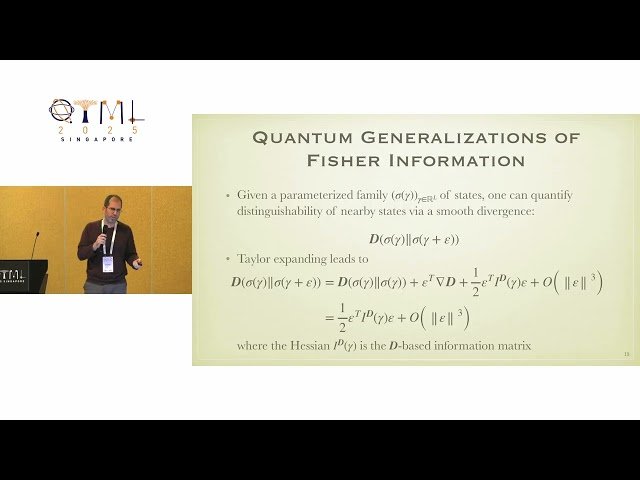 Explore the geometric foundations of parameterized thermal states and their applications in quantum machine learning through this 23-minute conference talk from QTML 2025. Delve into the mathematical formulations underlying Fisher–Bures and Kubo–Mori information matrices for thermal states, and discover quantum algorithms that estimate these matrix elements using classical sampling, Hamiltonian simulation, and the Hadamard test. Learn how these theoretical developments enable a natural gradient descent algorithm specifically designed for quantum Boltzmann machine learning that accounts for thermal state geometry. Examine the fundamental limitations of Hamiltonian parameter estimation when working with thermal-state samples, including an asymptotically optimal measurement algorithm for single-parameter estimation. Understand how the natural gradient approach can be applied to any machine learning problem utilizing the quantum Boltzmann machine ansatz, bridging quantum information theory with practical machine learning applications.