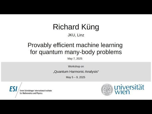 Explore a comprehensive lecture on the application of classical machine learning to quantum many-body problems, delivered by Richard Küng at the Workshop on "Quantum Harmonic Analysis" at the Erwin Schrödinger International Institute for Mathematics and Physics. Discover how classical ML algorithms can efficiently predict ground-state properties of gapped Hamiltonians after learning from other Hamiltonians in the same quantum phase of matter. The presentation combines signal processing with quantum many-body physics and builds upon the classical shadows framework, offering both theoretical proofs and supporting numerical experiments. The 57-minute talk is based on collaborative research with Hsin-Yuan (Robert) Huang, Giacomo Torlai, Victor Albert, and John Preskill, as published in Science 2022, along with subsequent follow-up works.