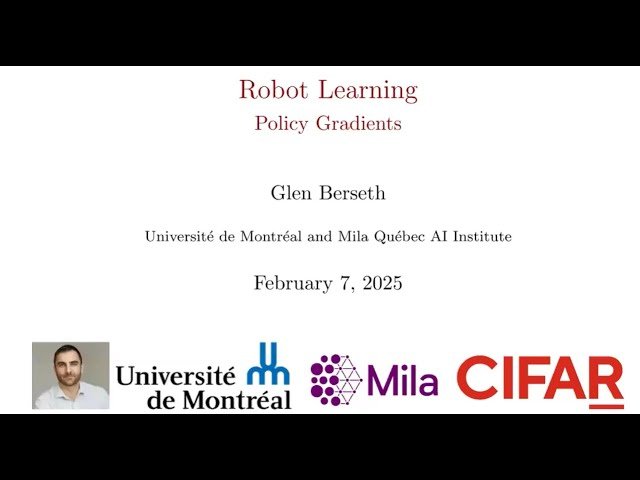 This lecture from the Montreal Robotics series explores reinforcement learning (RL) in robotics contexts, with a deep focus on policy gradients and their real-world applications. Learn about autonomous cleaning robots as practical examples of scaled RL implementation. Discover how policy gradients optimize reward functions without explicitly modeling environmental dynamics, and examine different policy distributions including cross-entropy for discrete actions and Gaussian distributions for continuous actions through interactive demonstrations. Gain insights into the mathematical foundations of policy gradients, understanding their sampling-based approach and how policy parameters are optimized to maximize expected returns. The lecture includes a comprehensive walkthrough of a robotics dataset homework assignment using Google Colab, covering essential techniques for data processing, standardization, and model training, with specific guidance on challenges like action dimension scaling. Access the accompanying materials on GitHub to practice implementing these concepts.