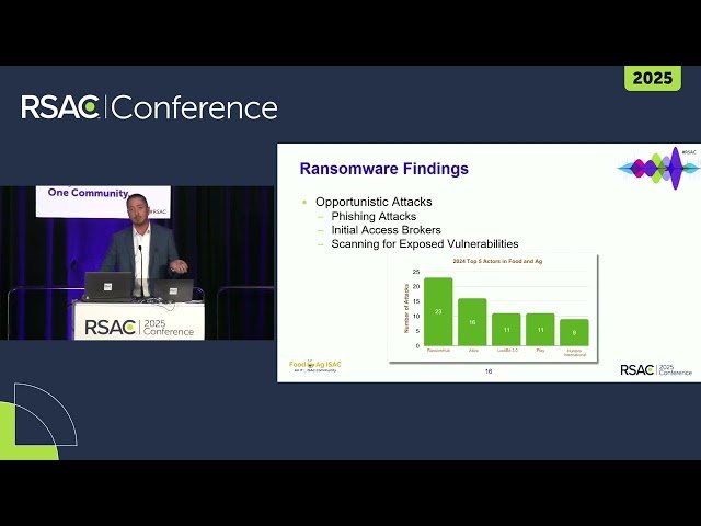 This 49-minute conference talk from RSA Conference features Jonathan Braley, Director of Food and Ag-ISAC, discussing cybersecurity threats facing the food and agriculture sector. Explore how this critical infrastructure sector has become a target for threat actors seeking monetary or political gain. Learn about the specific cybersecurity dangers threatening food supply chains, identify major threat groups actively targeting the industry, and understand emerging trends to monitor. The presentation includes an interactive component where attendees can ask questions about protecting this essential sector that provides vital resources to the nation.