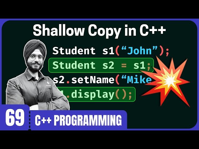 Learn about shallow copy in C++ programming through this comprehensive 25-minute tutorial that explores the concept, implementation, and potential issues. Discover what shallow copy means in the context of C++ object copying and how it differs from deep copy operations. Follow along with practical C++ program examples that demonstrate shallow copy implementation in real code scenarios. Understand the fundamental problems and limitations associated with shallow copy, including memory management issues and potential data corruption that can occur when multiple objects share the same memory addresses. Gain insights into when shallow copy might be appropriate and when it should be avoided in your C++ applications. Master the technical aspects of how shallow copy works at the memory level and learn to identify situations where shallow copy could lead to runtime errors or unexpected behavior in your programs.