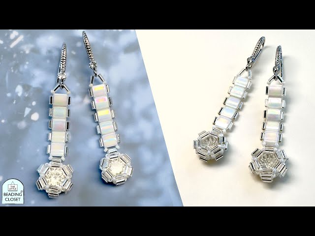 Learn to create elegant dangling earrings featuring tila beads and sparkling crystal elements in this 12-minute beading tutorial. Master the technique of bezeling an 8mm chaton using size 15 seed beads and 3mm bugle beads to create a stunning crystal drop centerpiece. Discover how to incorporate tila beads with bugle bead accents for added sparkle and texture. Follow along as the instructor demonstrates the complete construction process, from creating the crystal bezel foundation to assembling the final earring design with white gold plated findings. Customize the length to your preference and adapt the classic bridal white color scheme to any palette of your choice. Gain hands-on experience with essential beading techniques including chaton bezeling, tila bead manipulation, and professional finishing methods for creating polished jewelry pieces.