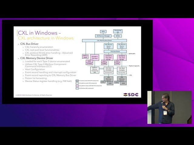 Explore the architecture and implementation of CXL (Compute Express Link) memory support in Windows through this 52-minute conference presentation from SNIA SDC 2025. Discover how Microsoft has integrated CXL memory technology into the Windows operating system, including the underlying architectural decisions and design principles. Learn about various use cases and applications for CXL memory within Windows environments, understanding how this technology can enhance system performance and memory capabilities. Examine the RAS (Reliability, Availability, and Serviceability) workflows that ensure robust operation of CXL memory systems. Gain insights into the developer interfaces and APIs available for leveraging CXL memory in Windows applications, enabling you to understand how to programmatically interact with this advanced memory technology. The presentation is delivered by Chet Douglas and Scott Lee from Microsoft, providing authoritative insights into Microsoft's approach to CXL memory integration and the practical considerations for developers and system architects working with this emerging memory technology.