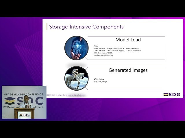 Explore the critical intersection of storage technology and AI workloads through a comprehensive analysis of Stable Diffusion's I/O patterns on NVMe-oF drives. Examine how generative AI models like Stable Diffusion create significant computational and storage demands in HPC environments, with particular focus on the I/O workload's impact on overall performance and scalability. Investigate various I/O patterns including read and write operations, latency, throughput, bandwidth, and LBA mappings, while understanding how Write Amplification Factor (WAF) influences generative AI workload performance. Discover how multiple concurrent user requests affect SSD WAF through detailed I/O pattern analysis. Learn about containerized Stable Diffusion deployment on FDP (Flexible Data Placement) enabled environments and how different storage configurations impact image generation efficiency while reducing WAF for both individual and concurrent user requests. Gain insights into a specialized tool that provides graphical visualization of logical block address (LBA) mapping, I/O hits, block size, and granular data access patterns for comprehensive I/O analysis. Understand deployment characteristics and I/O behavior of Stable Diffusion on NVMe-oF (RDMA/TCP) storage systems, study FDP and WAF influence in Stable Diffusion deployments, explore scaling workloads in containerized environments and their impact on model load times, and see demonstrations of utilities that provide detailed I/O activity insights including scatter diagrams of LBA mapping on storage systems.