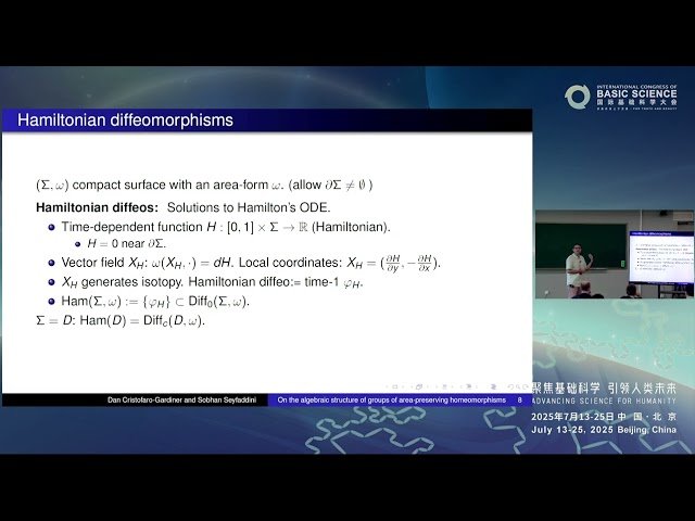 Explore the algebraic structure of groups of area-preserving homeomorphisms in this 58-minute conference talk by Sobhan Seyfaddini presented at BIMSA's ICBS2025. Delve into the mathematical foundations and properties of homeomorphisms that preserve area measures, examining their group-theoretic characteristics and structural relationships. Gain insights into advanced topics in geometric topology and dynamical systems as the speaker analyzes the algebraic framework underlying these important mathematical objects and their applications in contemporary research.