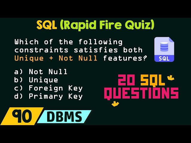 Test your SQL knowledge with this 22-minute rapid-fire quiz video featuring twenty challenging questions on Structured Query Language (SQL). Challenge yourself with this fast-paced assessment covering fundamental SQL concepts and syntax as part of the DBMS series from Neso Academy. Perfect for students preparing for exams or professionals looking to refresh their database management skills.