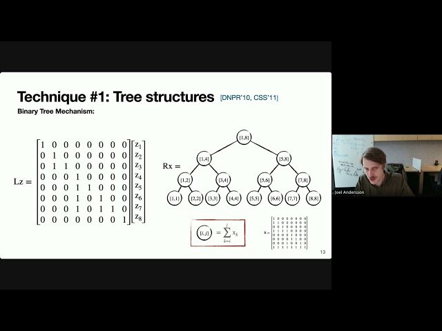 Learn about a novel approach to differential privacy in streaming settings through this 52-minute Google TechTalk. Explore the challenge of continual observation in differential privacy, where functions of datasets must be continuously released as data arrives one element at a time while maintaining privacy guarantees. Discover how traditional factorization mechanisms, while effective for continual counting problems, face significant space limitations in streaming environments due to their requirement for space proportional to input size. Examine a innovative binning solution that approximates factorization mechanisms in sublinear space by strategically grouping adjacent matrix entries with similar values to maintain matrix-vector products efficiently. Understand the theoretical foundations including provable sublinear space guarantees for lower triangular matrices with monotonically decreasing entries away from the diagonal. Analyze empirical results demonstrating how this low-space approach can match or exceed the performance of asymptotically optimal factorization mechanisms. Compare this binning methodology with alternative approaches such as rational function approximation techniques, and understand its applications in differentially private stochastic gradient descent implementations where continual counting plays a crucial role in maintaining privacy while processing streaming data.