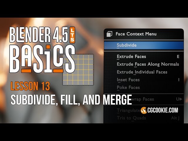 Learn essential mesh editing techniques in this 13-minute Blender 4.5 tutorial covering subdivide, fill, and merge operations. Master the subdivide tool to split edges and faces in half, creating additional geometry for detailed modeling work. Explore various fill options including standard Fill, Grid Fill for creating organized quad topology, and the Make Edge/Face tool for connecting selected vertices or edges. Discover the Connect Vertex Path feature for creating clean edge loops between vertices. Address common modeling issues by learning to identify and remove duplicate vertices using the Merge by Distance function, preventing topology problems that can cause confusion during modeling. Practice important hotkeys including F for Make Edge/Face, J for Connect Vertex Path, and M for accessing the merge menu. Understand when to apply each tool effectively in your modeling workflow and how these fundamental operations form the foundation of mesh editing in Blender.