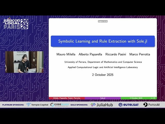 Explore symbolic learning and rule extraction through a hands-on tutorial featuring the Sole.jl Julia package in this 25-minute conference talk from JuliaCon Local Paris 2025. Learn how symbolic learning differs from neural networks by creating interpretable models that can be translated into logical rules, making them more readable and explainable than traditional statistical approaches. Discover the comprehensive SOLE framework (SymbOlic LEarning), an open-source Julia ecosystem that guides users through the entire process from initial data preprocessing to symbolic model creation and rule extraction. Master the integration of Sole.jl with popular packages including DecisionTree.jl, ModalDecisionTrees.jl, MLJ.jl, and XGBoost.jl for building decision trees and ensemble models like random forests. Understand how to work with non-tabular data such as images and time-series by leveraging SoleData.jl to interpret datasets as logical interpretations using modal logic frameworks. Get introduced to two new additions to the SOLE ecosystem: ModalAssociationRules.jl for mining association rules between instances, and SolePostHoc.jl for extracting, interpreting, and simplifying rule sets from symbolic models. Follow practical demonstrations showing how to fit decision tree models, extract logical rules, and manipulate them for enhanced interpretability, emphasizing the framework's user-friendly design and comprehensive capabilities for symbolic machine learning applications.